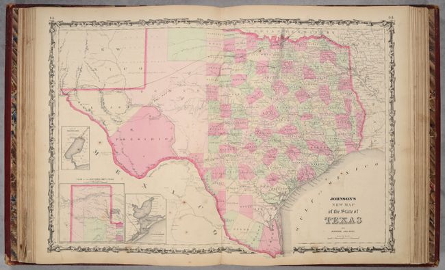 The double-page map of Texas shows county development mostly in eastern Texas and only the three large counties of El Paso, Presidio and Bexar in the west. The panhandle, noted as the Staked Plains (Elevated Table Land, without Wood or Water), includes a large section that is unorganized. There is nice depiction of the wagon roads, many named, with several completed railroads. The inset maps include a 'Plan of Sabine Lake,' 'Plan of the Northern part of Texas,' and 'Plan of Galveston Bay.' The map of the Northwest shows the newly created territory of Idaho. The map of Minnesota shows the newly created region of Dakota with an undefined western boundary.