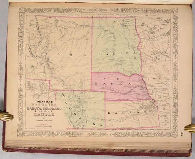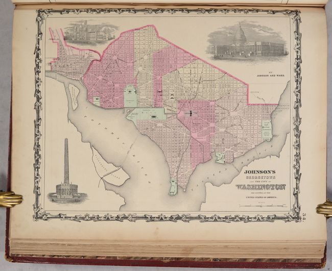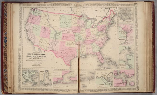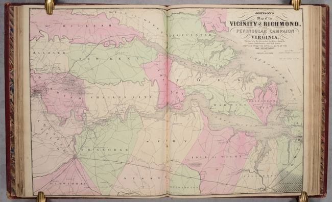 This atlas is complete with 66 beautifully rendered, steel engraved maps, including 34 double-page maps. There are several thematic maps and diagrams interspersed throughout the text that display the geology, weather, tides, agriculture, flags and animal kingdoms of the world. This 1863 edition is the last year with steel engraved plates, with many of the maps featuring vignettes, and some retaining the early strapwork-style borders. It also has the desirable edition of the New Military Map of the United States which shows all state and territory boundaries rather than the limits of military divisions. And it features the un-numbered double-page Civil War map Vicinity of Richmond.