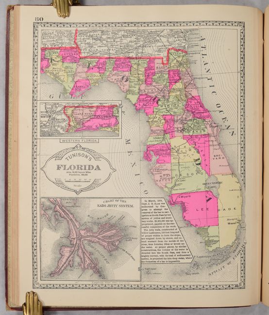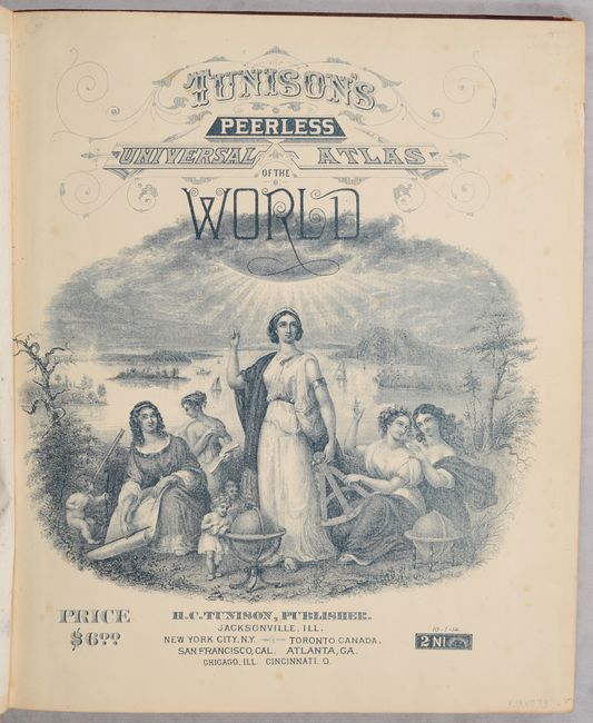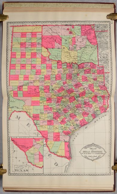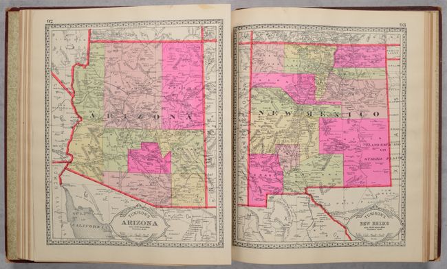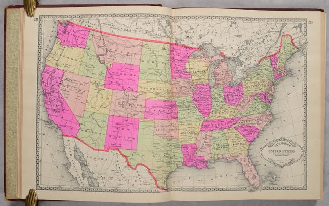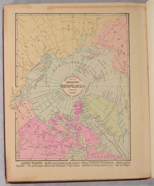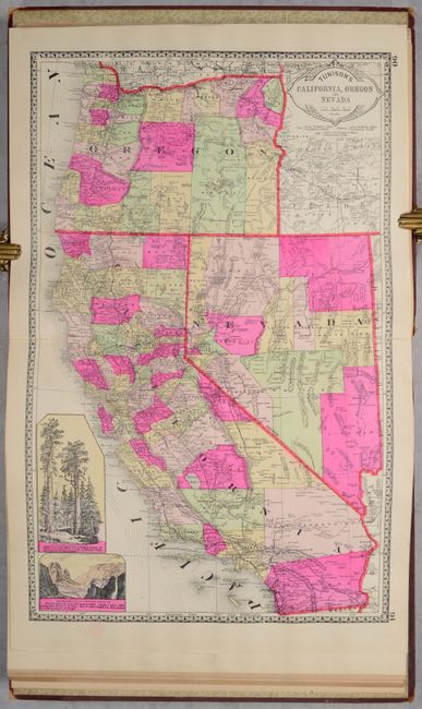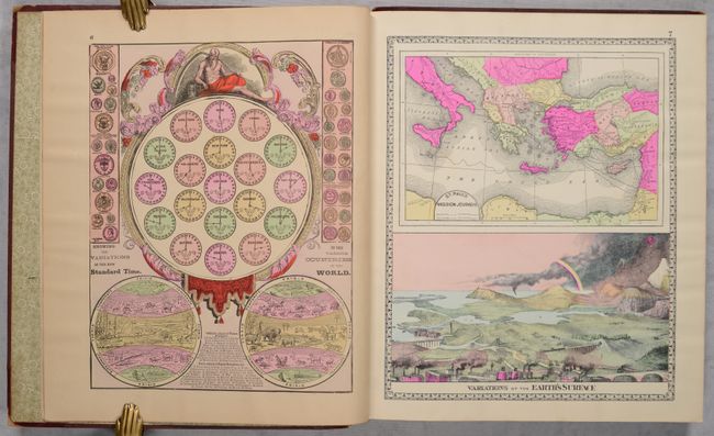 This attractive and unusual atlas is complete with over 80 wax engraved, hand colored maps and diagrams, most with decorative borders and some with vignettes. Nearly half of the maps relate to the United States. Most of the maps are printed on both sides. The map of California, Oregon, and Nevada is particularly nice with insets of Yosemite and the Redwoods. It also features two pages of presidential portraits and numerous engravings showing the diverse civilizations and cultures of the world. The last map is Map of the Regions about the Unknown North Polar Sea Showing the Latest Exploring Expeditions. These maps are uncommon for their late hand coloring, a laborious process that was largely abandoned two decades earlier. Small folio, 208 pages. Hardbound in original, embossed maroon cloth boards.
