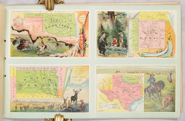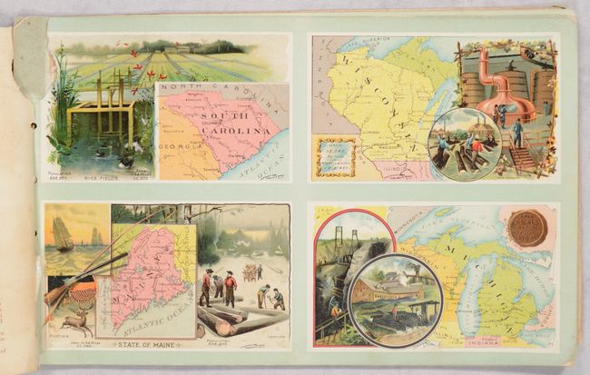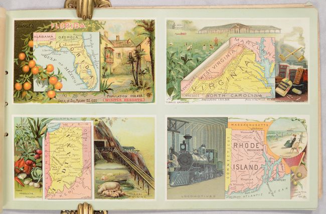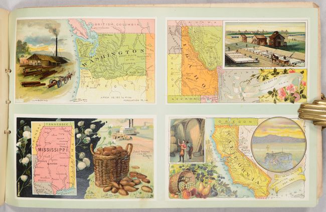 This unusual atlas was designed to advertise Arbuckle's Coffee. The atlas is printed on loose pages held together with original twisted string tie. This oblong 4to atlas has 12 sheets, each with four beautiful chromolithographic maps, plus the covers. The front pictorial cover features a fine bird's-eye view of the Capitol building in Washington with an eagle and small map of the District of Columbia on the U.S. shield. The back cover has a great map of Alaska surrounded by regional views of seals and whalers caught on an ice field by two polar bears, plus a moonlit view of the Arbuckle's Coffee factory in New York. Each of the 48 interior maps is surrounded by vignettes showing the beauty and commerce of the state, with text on the facing page describing the state or territory. Each of the 50 maps is beautifully lithographed in full color.