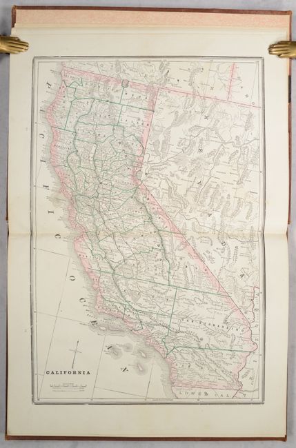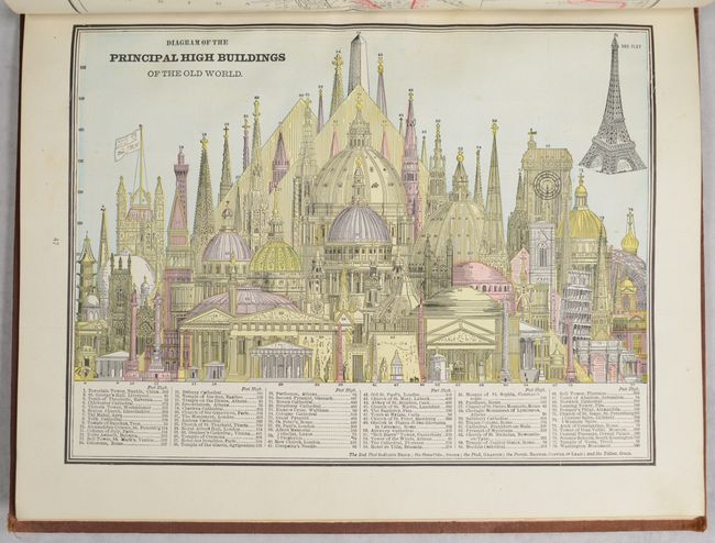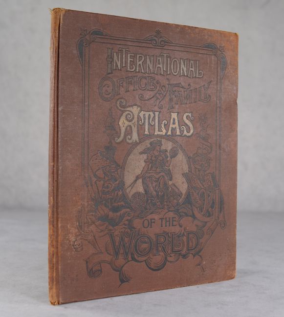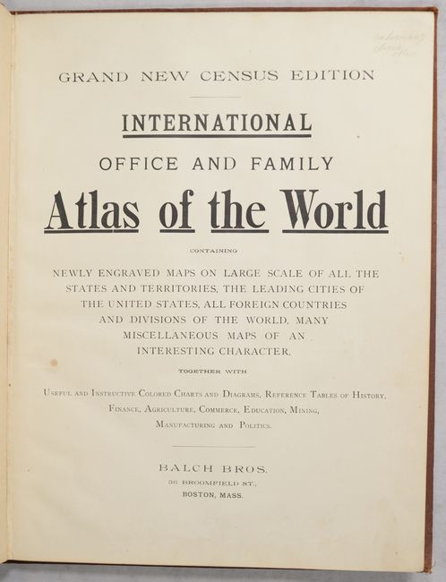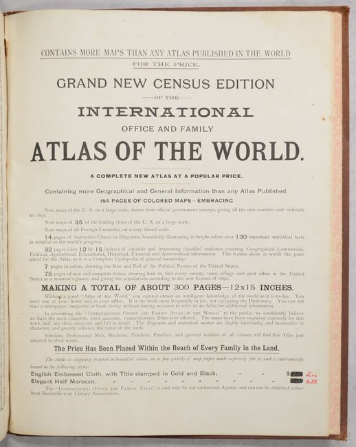 This is an unusual example of this late 19th-century atlas published by the Balch Bros. in Boston. It is a sales agent's demonstration copy of the "Grand New Census Edition," with an advertisement in the back noting the up-to-date prices in red manuscript ink ($5 for English embossed cloth, $6.50 for "elegant" half Morocco) and manuscript notations on a couple prospective buyers. Sample strips of the binding options are attached to the pastedown. As it is a demo copy, it is incomplete; whereas the advertisement promises approximately 300 total pages, with 164 pages of colored maps - "more maps than any atlas published in the world for the price" - this example only has 33 maps, plus 14 additional pages of color diagrams and charts. 11 of the maps cover states (including Maine, New York, New Jersey, Pennsylvania, Michigan and Wisconsin, and California); 14 cover cities (including Boston, Brooklyn and New York City, Richmond, Washington, Pittsburgh, Denver, San Francisco, Dallas, and Montreal); and the final 8 cover international areas (including Ireland, Germany, Sumatra, and the Turkish Empire). The maps appear to be copies of George F. Cram & Co. atlas maps. Following the maps are Diagram of the Principal High Buildings of the Old World and 13 graphs and charts showing the area of the world, statistics on education, economics, resources, and religions, population figures, and more. This is followed by a "Dictionary of Statistics" and lists of cities by state. 82 pages. Hardbound in sienna cloth with title and decoration on front cover.
