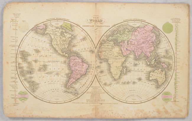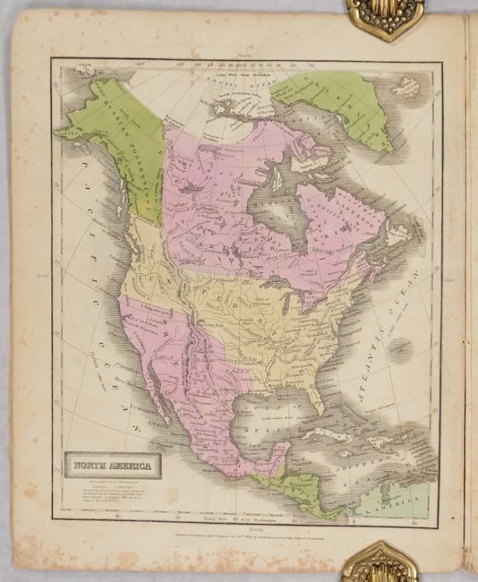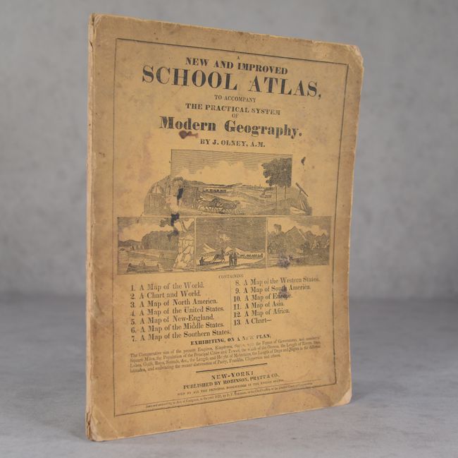 This school atlas is complete with 12 maps, each either dated 1828-29 or not dated. The cartography in the United States map shows Wisconsin Territory between Lake Michigan and the Missouri River. The large Missouri Territory extends from the Missouri River to Oregon Territory and south to include Indian Territory. Texas still appears to be part of Mexico despite this atlas being published during the Republic period. Northern California is "Unexplored Region." On the North America map, the boundary in the Northwest extends well into British America with notation "Boundary determined 1824." Maps included are: World in Hemispheres (double-page); World with thematic chart of religions; North America; United States (double-page); Eastern States; Middle States (double-page); Southern States (double-page); Western States (Missouri through Ohio - double-paged); South America; Europe; Asia; and Africa. The thirteenth engraving is a thematic chart exhibiting comparative size, population, and forms of government across the globe with four engraved vignettes showing Morocco, Constantinople, and New York. Printed paper covers double as the title page and list of maps. Published by Robinson, Pratt & Company.