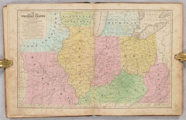 This is the complete first edition, first issue, of Mitchell’s famous school atlas. It includes 8 single-page and 4 double-page maps along with tables and statistics. All of the maps are dated 1839. The Republic of Texas is depicted in its smaller configuration along the Nueces River and can be seen on both the maps of North America and United States, which further notes "Herds of Buffaloes and Wild Horses" and "Extensive Prairies" in Texas. On this same map, Oregon Territory fills the Northwest and extends well into present-day British Columbia reflecting the ongoing boundary dispute with Britain. The Map of the Western States features an early depiction of Iowa Territory. Table of contents is located on the rear cover. Hardbound with pictorial paper over boards.