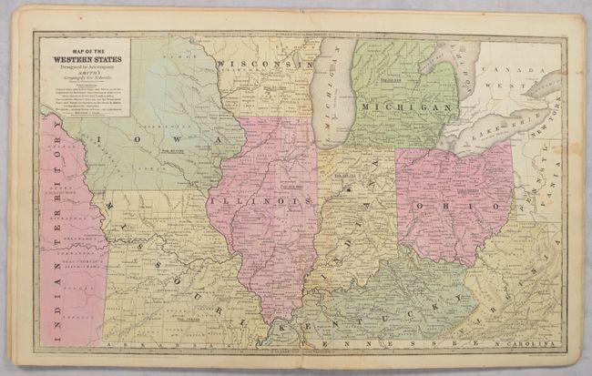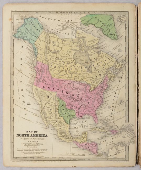 This school atlas contains 9 single-page and 5 double-page maps of the world, continents, regions in the United States, Britain, and Central Europe. Texas is shown as an independent republic on the world, North America, and U.S. map. This latter map, entitled Map of the United States and Texas, features some early territorial borders in the West in addition to the Republic of Texas. Oregon Territory covers the Northwest and extends well into Canada. The huge Indian Territory lies north of Texas and extends to the Mandan District, which in turn goes to the border with Canada. Iowa Territory is in a rare configuration, stretching from Missouri to the Canadian border and bounded east and west by the Mississippi and Missouri rivers. The large inset at lower left is a detailed "Map of Mexico and Guatimala" and also shows the Republic of Texas. All maps are copyrighted either 1839 or 1843 and the front cover is dated 1843. Bound in stiff illustrated paper covers.