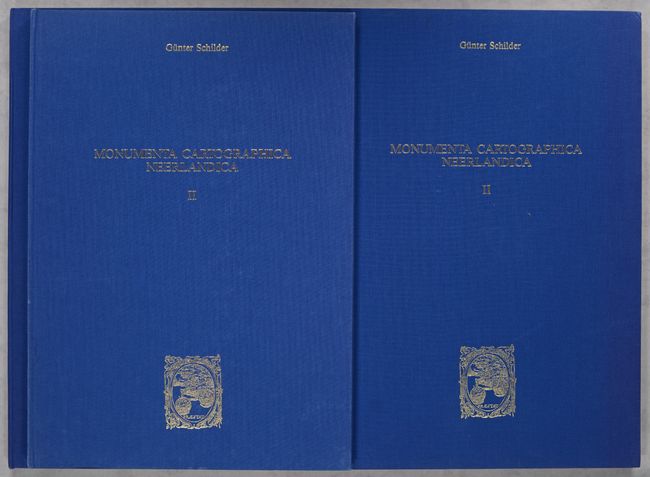 This is the second volume in this incredible series on the history of cartography. Volume II primarily focuses on three mapmakers in 16th-century Antwerp: Ortelius, Joan Baptista Vrients, and the Galle family. The book's four sections cover the Ortelius world map of 1564, his wall map of Asia (1567), the Ortelius-Clusius wall map of Spain (1571), and the Vrients' wall map of the Seventeen Provinces, with their various editions and derivatives. Text volume in both Dutch and English, 171 pp., profusely illustrated, together with the portfolio containing full-size facsimile reproductions of 9 maps on 45 sheets. The maps reproduced in the portfolio are the Ortelius wall map of the world (8 sheets); the de Jode folio version (1 sheet); the Ortelius wall map of Asia (8 sheets); the Ortelius-Clusius wall map of Spain (6 sheets); the Galle-Vrients wall map of the Seventeen Provinces (16 sheets); the Galle map of the Central Netherlands (3 sheets); the folio version of the Seventeen Provinces map (1 sheet); the Joannes en Baptista van Deutecum folio version (1 sheet); and the Frederick de Wit folio versio (1 sheet). Hardbound in blue cloth with gilt embossed titles.