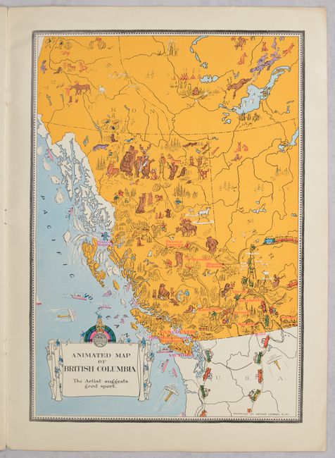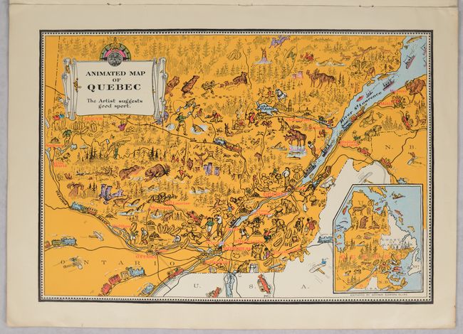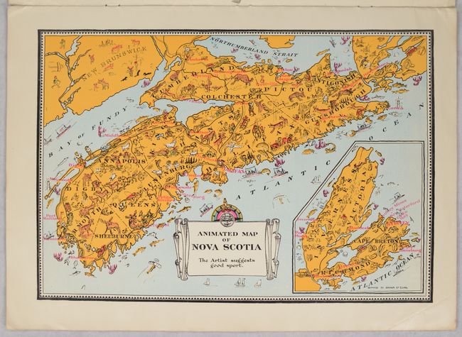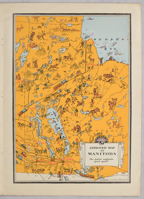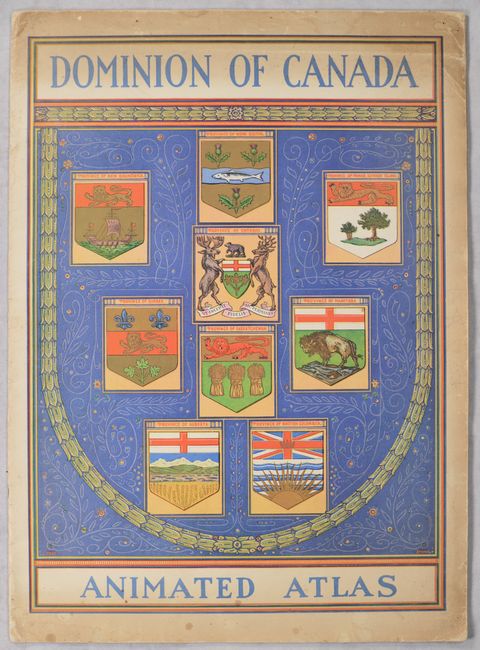 Issued by Canada's Department of the Interior and Natural Resources Intelligence Service, this charming pictorial atlas features 9 "animated maps" of the provinces by Arthur Edward Elias. The maps include Prince Edward Island, Nova Scotia, New Brunswick, Quebec, Ontario, Manitoba, Saskatchewan, Alberta, and British Columbia. Each map mixes illustrations of the province's natural resources with playful cartooning showing wildlife and the people of the region, often interacting with comical results. Accompanying text by Oliver Master emphasizes each province's natural resources and distinctive character. The illustrated paper covers are a work of art in their own right, with a lovely depiction of each province's coat of arms. Although the individual maps can be found for sale, this is the first time we have seen the complete atlas on the market.