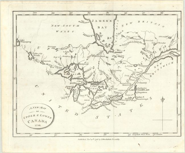 B. A New Map of Upper & Lower Canada, dated 1798 (9.1 x 6.8"). This small map is centered on the Great Lakes and extends from Lake Winnipeg in the west to the mouth of the St. Lawrence and Anticosti Island in the east. There is nice detail of watersheds, shoreline and the southern portion of James Bay. The map locates a number of important forts including Ft. Chambly and Ft. George. Published by John Stockdale on November 10, 1798. Condition: Issued folding with faint offsetting and minor foxing mostly in the blank margins. (B+)