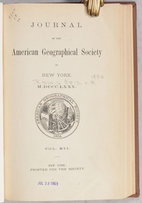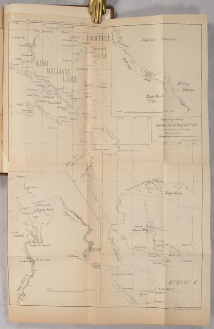 This 296-page volume is the twelfth report from the American Geographical Society. Contents include the list of officers, charter, by-laws, members, transactions of the society, and a number of academic papers including: "The Bad Lands of Wyoming" by Professor John McMaster; "A Journey Around the World" by Benjamin Curtis"; "Arctic Exploration" by Reverence B.F. De Costa; and "Arctic Meeting for the Reception of Lieut. Schwatka and his Associates of the Franklin Search Party." This last report (pp. 237-296) includes two maps showing the tracks of the party's snow sledges in search of evidence of Franklin's expedition and ships, the HMS Erebus and HMS Terror. The first map (12.7 x 13.2") delineates the party's route along the western coast of King William Island and surrounding islands. The second map (9.9 x 14.3") presents the team's tracks from northwestern Hudson Bay through portions of Nunavut to King William Island. The ships were finally discovered in 2014 and 2016, following a multi-year search combining modern sonar technology with traditional Inuit knowledge. Hardbound in brown buckram.