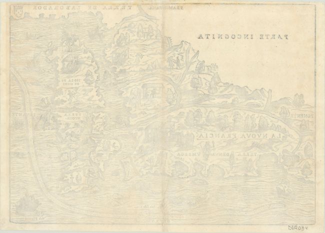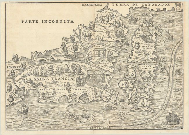 This unusual map is the first to focus on the area of New England and New France and the first to use the name Nuova Francia. Derived from Gastaldi's 1548 regional map, the cartography is based largely on Verrazzano and Cartier's reports resulting in a curious depiction of the Hudson and St. Lawrence rivers. Newfoundland is identified as Terra Nuova, below the large Isola de Demoni, appropriately decorated with demons. The area near New York Harbor is titled Angoulesme. Long Island, which Verrazzano imagined as a peninsula, is labeled Flora. Newport Bay is called Port Real and Narragansett Bay is Port du Refuge. A long, snake-like band, speculated to be an early representation of the Gulf Stream, marks the rich fishing banks. The map is populated with scenes of Native Americans hunting and fishing, elaborately engraved ships, and fanciful sea monsters. This example is the second state, as evidenced by the addition of weeping willow trees.