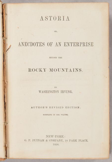 The map is still bound into a revised later edition of Washington Irving's Astoria or, Anecdotes of an Enterprise Beyond the Rocky Mountains, complete in one volume. Irving's history concerns John Jacob Astor's attempt to bring the fur trade across the Rockies and to the shores of the Pacific. It was based on revised transcripts of the journals of Robert Stuart, Wilson Price Hunt, and Ramsay Crooks. 519 pages. 12mo. Hardbound in contemporary leather with black leather title labels on spine and marbled endpapers.