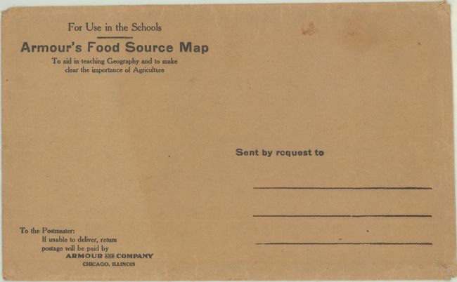 This is the first edition of Armour's persuasive food source map of the United States, touting "The Greatness of the United States is Founded on Agriculture." The colorful map is absolutely filled with small illustrations showing the variety of agricultural products harvested across the country. These illustrations are keyed to a legend at right identifying 25 different products with cattle, hogs and sheep listed first. Armour plants are also depicted on the map and concentrated in the middle of the country. A lengthy quotation by J. Ogden Armour, son of company founder Philip Armour, ends "because nearly all industries depend on agriculture, the prosperity of the entire nation is inseparably linked with the marketing of meat and other animal products through the packing industry." The verso features an elaborate article furthering Armour's view entitled "Nation's Ever-Growing Food Problem Has Been Met by Packing Industry." Self-folding. This example includes the original mailing envelope, stating that the map is "For Use in the Schools" "to aid in teaching Geography and to make clear the importance of Agriculture."