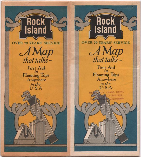 This promotional map for the Chicago, Rock Island and Pacific Railroad (or Rock Island Line) was published by the Poole Brothers in Chicago. It delineates the railway's routes branching from its headquarters in Chicago. The jointly operated western lines, the Golden State Limited and the Rocky Mountain Limited, are also traced. National parks are prominently depicted in green. Self-folding (4.1 x 9.1") with pictorial covers that note that this is "A Map that Talks - First Aid in Planning Trips Anywhere in the U.S.A."