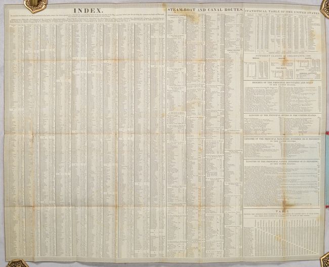 This pocket map presents the United States west to the Mississippi River and a little beyond to include a small portion of Missouri Territory. The map is very detailed and features nine insets; namely the Vicinity of Philadelphia, Washington, Charleston, Boston, New York, Cincinnati, Albany, New Orleans plus the Vicinity of the Falls of Niagara. The labyrinth of canals and early roads are clearly shown. The legend shows a dotted line for railroads. The South Carolina Canal and Rail Road (also known as the Charleston & Hamburg Road) is clearly delineated. By 1833 the railroad had been completed to Hamburg, making it the longest railroad in the world at 137 miles. This series of maps, first published in 1832, was designed for the market represented by the burgeoning number of travelers and new immigrants. The maps were printed on thin bank note paper and folded so they could be carried easily for quick reference while traveling. Map folds into original red leather covers with gilt tooling and title, with the original separate Index sheet which unfolds to the same size as the map. The map was "Engraved on steel by J.H. Young & D. Haines" and bears the copyright date of 1834. This is a rare edition given the inclusion of the large folding index sheet rather than the 78-page booklet. The cover is titled Mitchell's Travellers Guide Through the United States.