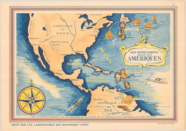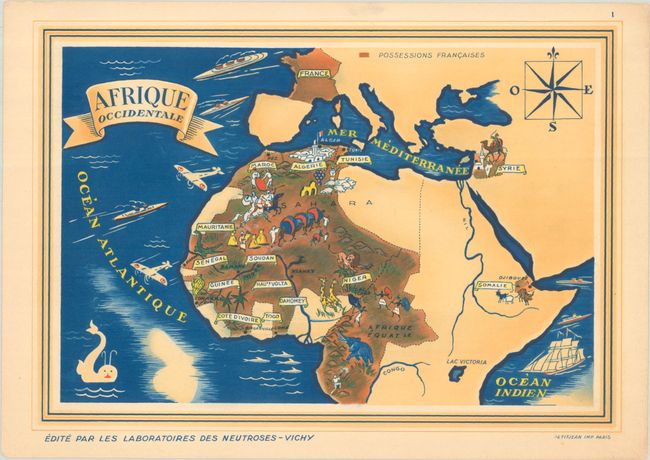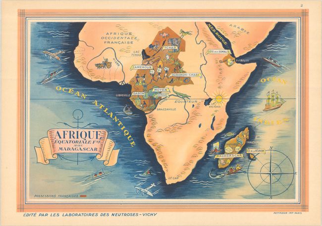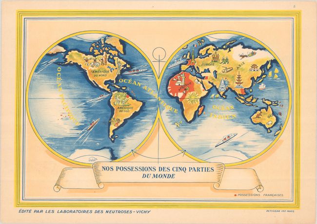 This decorative and complete set of promotional maps issued by Vichy Laboratories highlight French possessions across the globe. French ownership is highlighted in brown/orange shading with vignettes presenting the region's wildlife, natural resources, and culture. Related French text and illustrations on verso describe each region. All but one map is tissue-guarded. The list of maps include: