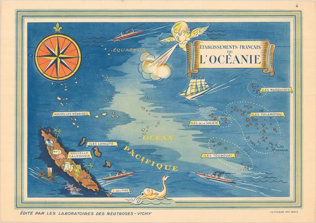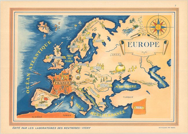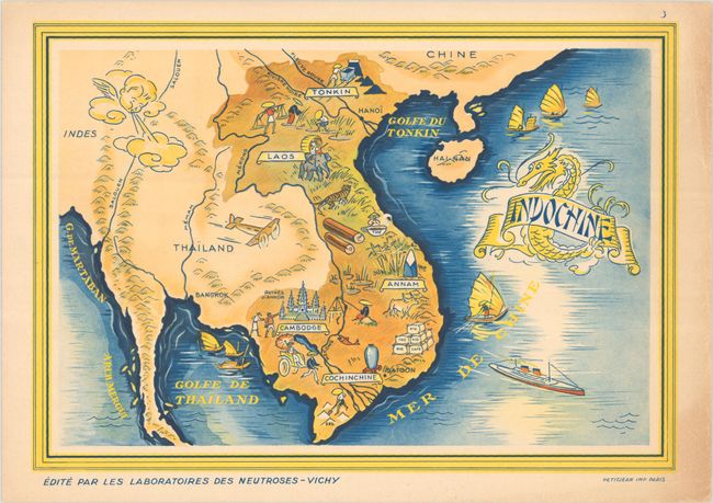 Vichy Laboratories used these maps to promote their products "Neutroses-Vichy" and "Vegerenyl," which are advertised on verso (the tissue guards also advertise Bronchoseptol). Neutroses-Vichy was an antacid created to treat upset stomach, and Vegerenyl was purported to treat ailments affecting the kidney and bladder; however the Vegerenyl ad on verso is partially obscured by an ink stamp indicating that production of the product had been suspended. Printed by Petit Jean.