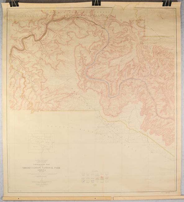 This is the first edition of this remarkably detailed two-sheet map of the Grand Canyon National Park. The topography is based on the comprehensive surveys of Francois E. Matthes and Richard T. Evans conducted between 1902-1923. The map shows the park bounded in the north by the Grand Canyon National Game Preserve and Kaibab National Forest and in the south by Tusayan National Forest. The key identifies roads and buildings, cliff dwellings, trails, railroads, reservation lines, mines or quarries, contours, sand, streams, lakes, and more. That this map was reissued in 1939 and again in 1948 is a testament to the skill and accuracy of Matthes and Evans' survey. The eastern sheet measures 38.2 x 42.6" and the western sheet measures 39.4 x 43.7".