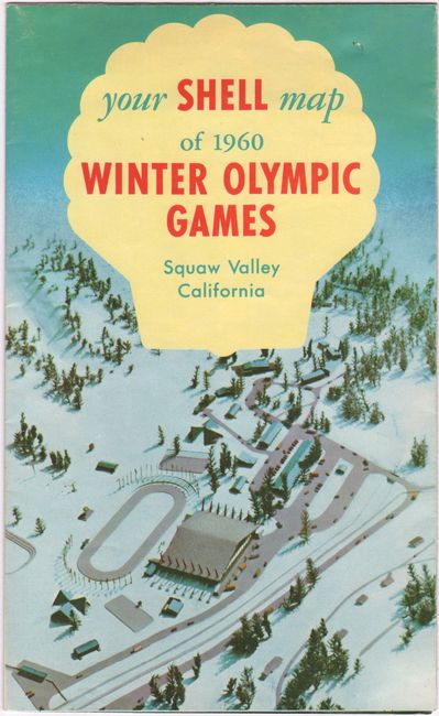 This delightful souvenir map centers on the site of the 1960 Winter Olympic Games in Squaw Valley, California, now known as Olympic Valley. The 6,000 acres of the host resort are enlarged to better show the Olympic Village, slopes, courses, and facilities. The map extends into the surrounding regions, showing Placerville, the Sierra Nevada Mountains, Lake Tahoe, Reno, and Carson City. The landscape's roads, lakes, rivers, and peaks are graphically depicted, and the map is teeming with charming illustrations of skiers, resort-goers, prospectors, cowboys, painters, fishermen, bucks, cattle, and much more. Credited to Don Bloodgood and prepared and published by Shell Oil Company. The Shell logo appears on the decorative compass rose. The 1960 Winter Olympics were the first to be televised. This is the only pictorial map of the event available on the contemporary market. Folds into a pamphlet with tinted photographs of various sites of interest in the area on verso.