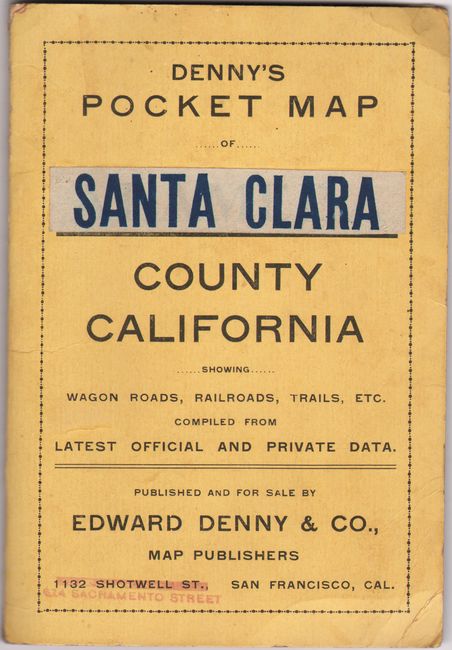This scarce and unusually detailed pocket map of Santa Clara County was published by Edward Denny & Co. in San Francisco. Printed in blue ink, the map is divided into townships and identifies roads, private roads, railroads, electric railroads, power lines, mines, trails and more. The street-grid patterns of Gilroy, San Jose and Santa Clara are all depicted along with the boundaries of many ranchos. Decorated by an elaborate compass rose at upper right and large circular title cartouche at lower left. Folds into printed paper wrappers (4.3 x 6.3"). Santa Clara County's population was about 90,000 at the time of publication compared to nearly 2 million today.
