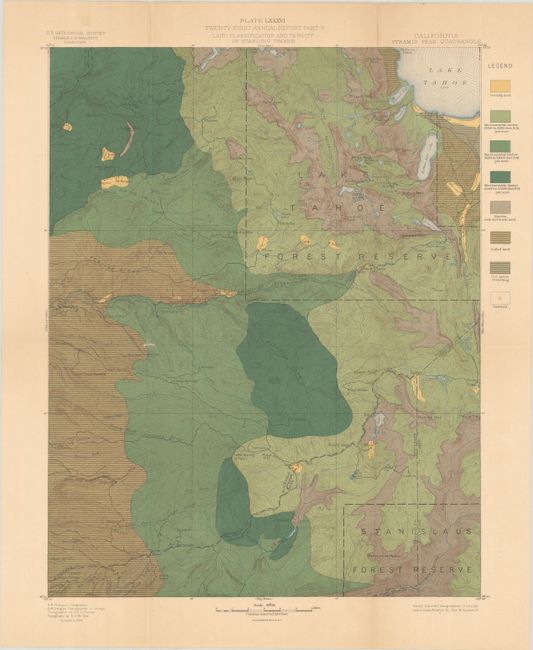 This lot features 9 vibrant land classification maps covering parts of the Sierra Nevada and San Joaquin Valley regions, surveyed from 1887 to 1889. Several national forests and state parks are shown in part, including Tahoe, Eldorado, Calaveras Big Trees, and Yosemite. The maps use vivid color to depict land use, showing merchantable timber, grazing land, cut areas, burned areas, culled land, cultivable land, mining camps, and sawmills. There is excellent detail of mountains, rivers, and lakes. The maps are on a scale of 1/125,000 or 1.8939 miles to an inch, with each covering an approximate area of 880 square miles. Executed under the direction of Charles D. Walcott. Henry Gannett was the head geographer, with land classification by George B. Sudworth. The individual maps are as follows: