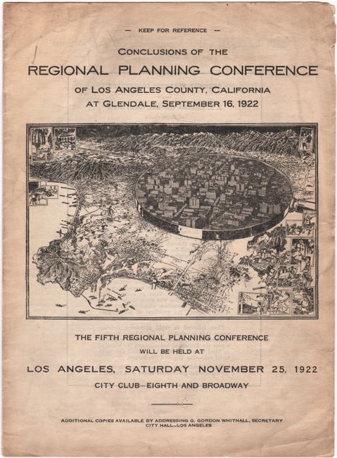 This 8-page document was produced by the Regional Planning Conference of Los Angeles County and features a centerfold map entitled Tentative Regional Highway System (9.3 x 13") and a bird's-eye view of the Los Angeles region on the front cover with a large magnifying glass over downtown. This Conference led directly to the formation of the Los Angeles County Regional Planning Commission, the first county planning commission in the United States. The Conference stemmed from the recognition that “the plastic communities of the Southland were rapidly crystallizing into a gigantic metropolis” and that the communities shared common interests and concerns requiring an interdependent approach. The ambitious proposal was to coordinate regional development of highways, subdivisions, sanitation, water supply, parks, zoning, etc. Highways were given priority as demonstrated by the featured centerfold map. The document and plan showed remarkable vision at a time the population of Los Angeles County was about 1,000,000 and enabled the rapid growth of the area to its current population of over 10 million. Illustrated paper wrappers. We found only one other example of this publication on OCLC (Harvard).