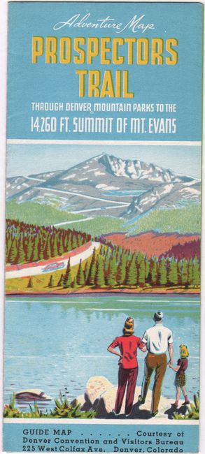 This wonderful pictorial map extends from Loveland Basin east to Denver and from Boulder south to Shaffers Crossing. Images of skiing, outdoor recreation, wildlife, and more pepper the landscape. A key identifies prospectors trails, highways and other roads, nation forest areas, trails, and state highway markers. Various peaks are named along with their elevation. The map is surrounded by ten vignettes, with summer activities on the left and winter activities on the right. Signed "F. F." and dated May 1942. Self-folds into brochure with an illustrated cover (3.7 x 8.5") and the title "Adventure Map Prospectors Trail Through Denver Mountain Parks to the 14 260 Ft. Summit of Mt. Evans." Printed by Smith-Brooks Printing Co. in Denver.