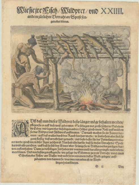 This fascinating engraving is Plate XXIIII from Part II of de Bry's Grands Voyages, which details the French adventures in Florida between 1562-65. It shows the method the Florida natives used to preserve fish and game for the winter. The food is suspended on a grate above a fire and dried with smoke. From the first German edition, published in 1591. On a sheet of German text measuring 9.4 x 12.6".