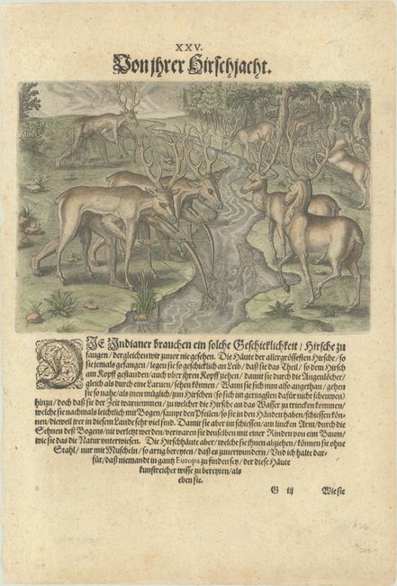 This striking engraving is Plate XXV from Part II of de Bry's Grands Voyages, which details the French adventures in Florida between 1562-65. It depicts the clever hunting techniques of the Indigenous peoples of Florida. Men disguise themselves as deer by hiding under deer skins and aim arrows at deer on the other side of a stream. From the second German edition. On a sheet of German text measuring 9.7 x 14.3".