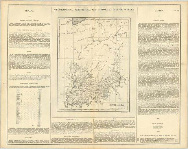 The map is on a full folio sheet (21.9 x 17.5") surrounded by English text giving a brief description of Indiana's boundaries, rivers, climate, chief towns, government, and history. The finely engraved map delineates the counties, roads, and major towns. Development is confined to the southern portion of the state, with the large Delaware and Wabash counties occupying the middle of the state. The Indian Boundary line is prominently depicted in the north. Drawn by Fielding Lucas, Jr. and engraved by Young & Delleker.