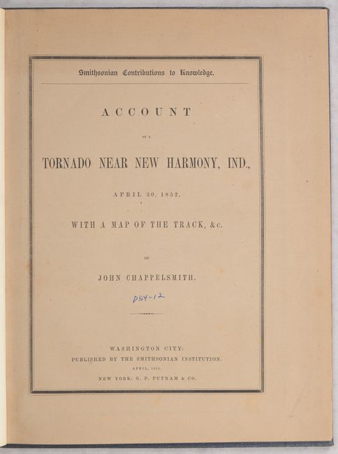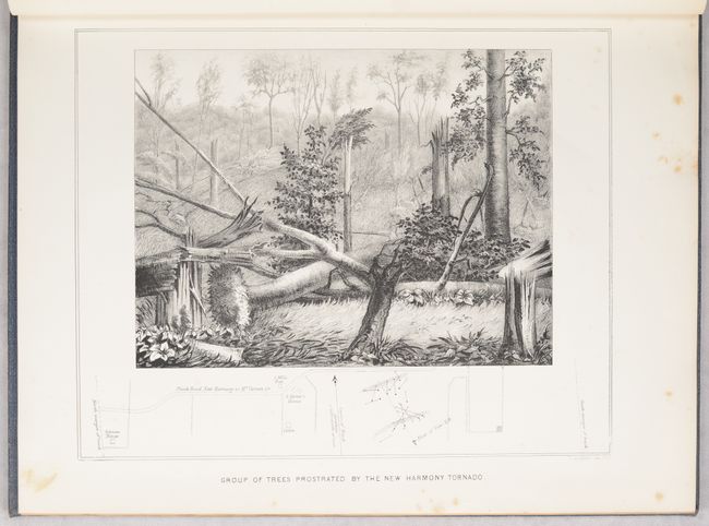 Uncommon and important report and map of a tornado which occurred in southern Indiana on April 30th, 1852. Chappelsmith's detailed study focuses on one square mile of the path of the mile wide tornado. It is impressive in that it shows the fall direction for well over a thousand trees, which must have been a very time consuming task without the aid of aerial surveillance. The map has three illustrations of twisted and broken trees and the report has a full-page lithograph displaying broken trees.