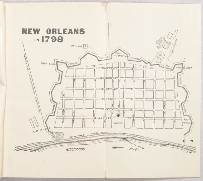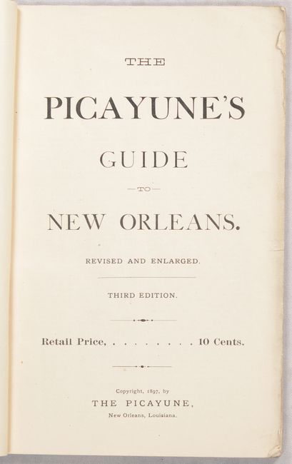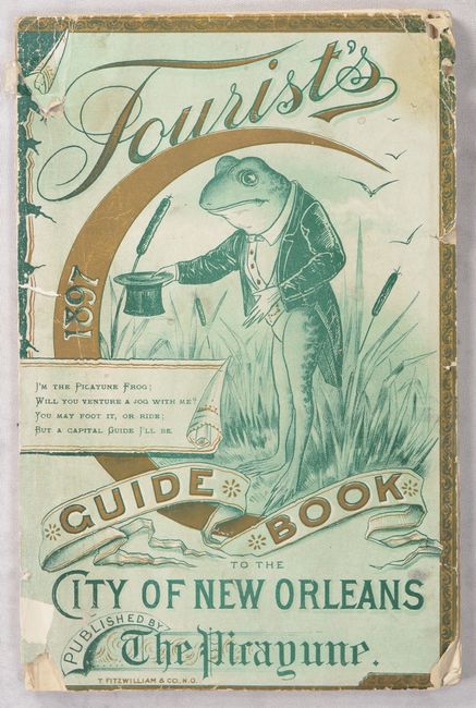 This guidebook was published by T. Fitzwilliam & Company in New Orleans. It features 3 small maps (10.2 x 8.8") of the city at the front of the volume including: A Map of the City of New Orleans 1897; Map of New Orleans - from Claiborne Avenue to the River, and from Lee Circle to Esplanade Avenue; and New Orleans in 1798. The 112-page text entices the reader about the city's unique charm including: "It is early in the morning, late in the season, and young in the year; it is the time of all times when this old, half-French, half-Spanish town of ours, with her beautiful women and foreign ways, her odd, grim houses, and lovely rose gardens, pink and bloomy, is at her best." Text is filled with related illustrations of the sites in the city not to be missed. Third edition. Pictorial paper covers.