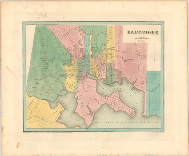 Baltimore. A detailed plan laying out the street grid pattern and dividing the city into 12 wards. Locates Fort McHenry, City Hall, Cathedral, Center Market, Baltimore College, and more.