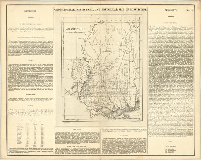 This map is on a full folio sheet (21.9 x 17.5") surrounded by English text giving a brief description of the state’s boundaries, rivers, climate, chief towns, government, and history. The finely engraved map delineates rivers, roads, counties and major towns. Development is confined to the southern portion of the state, with the large Choctaw and Chickasaw lands occupying the upper two-thirds of the state. Identifies "General Jackson’s Road from New Orleans to the Muscle Shoals" and Baron Bastrop's Claim in neighboring Louisiana. Drawn by Fielding Lucas, Jr. and engraved by Young & Delleker.