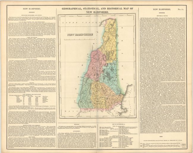 This 1827 edition map is on a full folio sheet (21.9 x 17.5") with surrounding text describing boundaries, climate, natural curiosities, chief towns, religion, commerce, government, history and more interesting information. The state is up to date with six counties delineated. A list of governors beneath the map spans from John Cutts in 1680 to David Lawrence Morrill in 1824. The historical sketch details New Hampshire's history from John Smith's discovery to statehood, concluding with the following: "Since the adoption of the federal constitution, no event of historical importance has occurred in New Hampshire." War of 1812 battle sites are marked with red flags at Dover and Charlestown. Engraved by Young & Delleker.