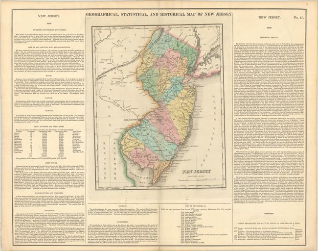 This map is on a full folio sheet (21.9 x 17.5") with surrounding text describing boundaries, climate, chief towns, religion, commerce, government, and history. The finely engraved map delineates rivers, roads, towns and counties. Fourteen counties are named with Warren County created from Sussex County in the northwestern portion of the state. The principle battle sites in the state from the War of 1812 are identified by small red flags including Trenton, Princeton, Monmouth and Springfield. A list of governors beneath the map spans from Lewis Morris in 1738 to Isaac H. Williamson in 1826. Engraved by Kneass.