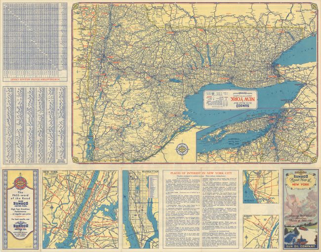 This is an early edition of this fun pictorial map highlighting the state's history, issued for Sun Oil Company (Sunoco). The city and vicinity is detailed in a large inset at top left, while the rest of the map covers upstate. Throughout the landscape, historical events are located with charming little illustrations, including Henry Hudson sailing his namesake river, the purchase of Manhattan, Burgoyne's surrender at Saratoga Springs, the invention of baseball in Cooperstown, and much more. There are also illustrations of architecture, recreation, universities, and the state's natural beauty, with an emphasis on waterfalls. The map is enclosed by a scroll border with descriptions of notable locations along the top and bottom. On verso are smaller maps showing the state's roads, New York City and vicinity, Manhattan, Buffalo, and Albany. Self-folding into pictorial covers (3.5 x 7.5") with the alternate title: Sunoco Road Map of New York Showing Historical and Other Points of Interest.