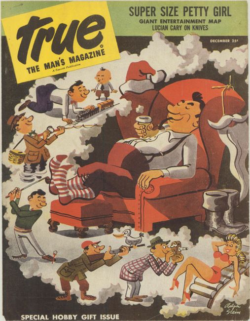 This scarce and splashy pictorial map of Manhattan by Paul Savitt was published in True, "the Man's Magazine." A legend identifies 77 sites of interest for visitors, several of which are then illustrated on the map in Savitt's fine graphic style. Sightseers can catch a ballgame at Yankee Stadium, take in a show on Broadway (Oklahoma and Harvey are among the shows pictorially represented here), watch a fight at Madison Square Garden, or check out the artists in Greenwich Village. The Statue of Liberty looms large at the bottom of the map, with a big welcome mat at her base. A compass rose is cleverly incorporated in a pocket watch design. Savitt (1924-2010) was a prolific painter and graphic artist based in the city for most of his long life. An illustrated pin-up appears on verso. This example also comes with the cover of the Special Hobby Gift Issue of True, illustrated by Ralph Stein.