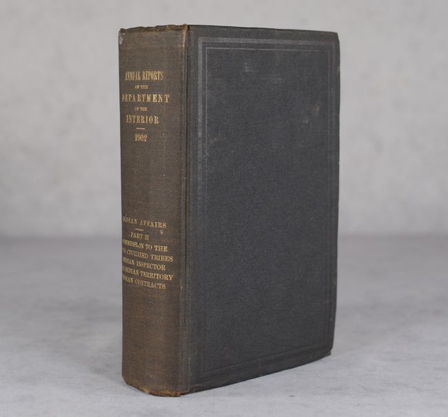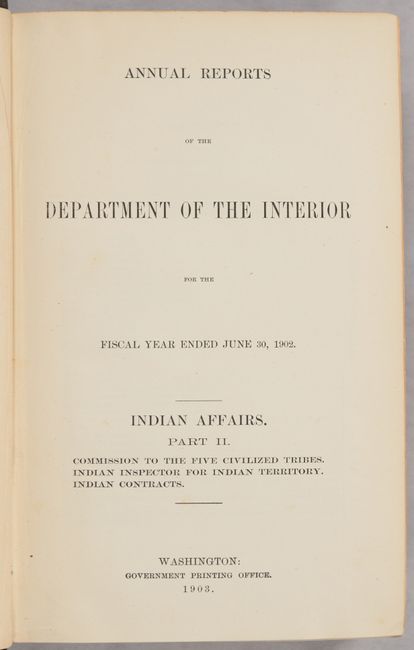 This is the ninth annual report of the Commission to the Five Civilized Tribes, with additional reports by the Indian Inspector to the Indian Territory, and an extensive listing of proposals received and contracts awarded for the Indian Service. The volume is well-illustrated with single-page black & white photographic plates, tables, and folding maps. Of particular interest is the map of Indian Territory (18.0 x 20.0") by Charles Fitch which matches the configuration of the rare State of Sequoyah, which the Indian Nations attempted to create in 1905 in an effort to thwart the expansive tendencies of the United States. It is also similar to the rare 1896 Senate edition which was issued in printed color. The regions of the Chickasaw, Choctaw, Creek, Seminole, Cherokee, and several other Indian tribes are named. The Territory of Okalahoma hovers ominously in the northwest. Fitch was the topographer in charge of the Indian Territory Surveys. The full listing of maps in the volume include: