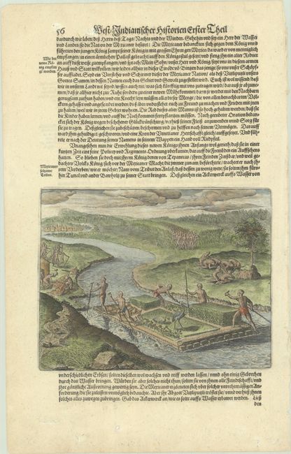 This unusual engraving originally appeared as Plate XII in Part IX of de Bry's Grands Voyages. The engraving illustrates the mythical origin of Tenochtitlan, which later became Mexico City. As depicted here, the Aztecs wandered through desolate regions until coming across Tunal, a prickly pear tree with an eagle clutching a smaller bird at top, as prophesied by their god Vitzliputzli. This area then flourished into Mexico City. In the foreground is a garden of maize and peas where storks and geese roam; this represents the Aztec's taxes to their chief. The plate was republished in Johann Ludwig Gottfried's Newe Welt und Americanische Historien, a collection of voyages. Also known as Historia Antipodum, Gottfried's work is an abridgement of de Bry's voyages to America that incorporates much new material. Matthaus Merian, de Bry's son-in-law and publisher for Historia Antipodum, was granted access to de Bry's copper-engraved plates. On a sheet of German text measuring 9.1 x 14.4".