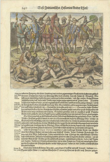 This striking engraving was originally published as Plate XXII in Part IV of de Bry's Grands Voyages. It depicts the brutal scene of Vasco Nunez de Balboa's massacring 40 Cueva peoples for what he perceived to be their deviant sexuality. Balboa, who had become Governor of Veragua (the Spanish colonial territory in Central America) in 1513, led an expedition from Santa Maria on the northern coast of Panama to the South Sea (the Pacific Ocean) in search of gold. On September 25, 1513, Balboa viewed the Pacific for the first time from the summit of a mountain, and is credited with being the first European to sight the ocean. The plate was republished in Johann Ludwig Gottfried's Newe Welt und Americanische Historien, a collection of voyages. Also known as Historia Antipodum, Gottfried's work is an abridgement of de Bry's voyages to America that incorporates much new material. Matthaus Merian, de Bry's son-in-law and publisher for Historia Antipodum, was granted access to de Bry's copper-engraved plates. On a sheet of German text measuring 9.3 x 13.6".