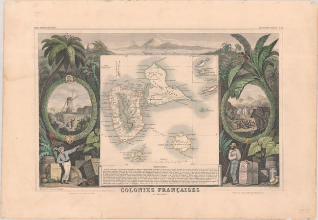 A. Colonies Francaises Martinique. Amerique du Sud. Lovely map of the island of Martinique displayed on a banner scroll, surrounded by steel engraved vignettes featuring the riches of the colony. Empress Josephine, the wife of the Emperor Napoleon, was born on this island, and is shown in a bust at the right. Engraved by Laguillermie.