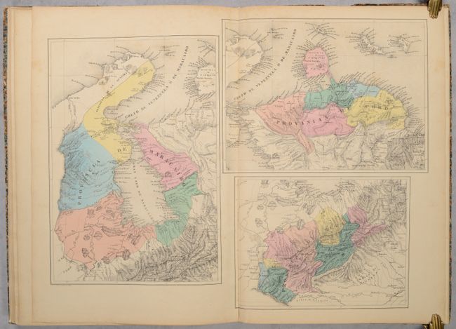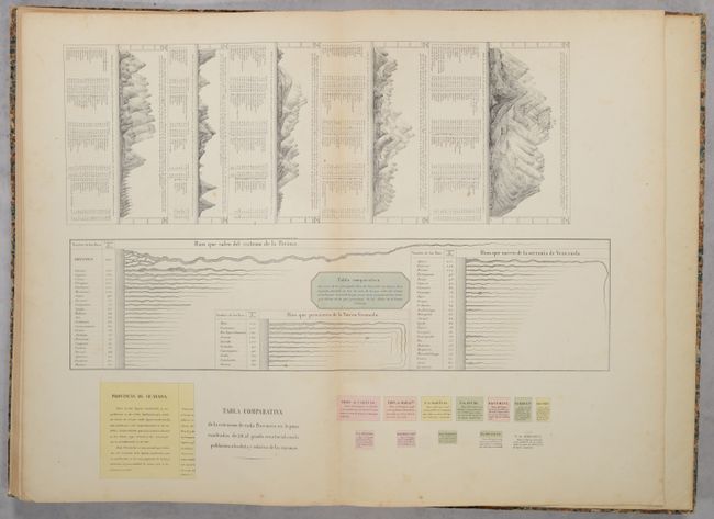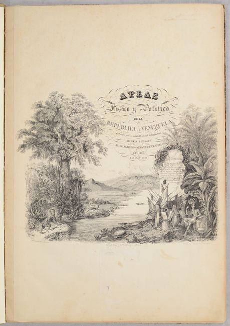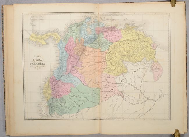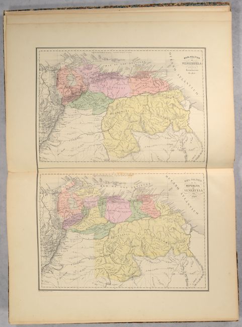 Following Venezuela's detachment from Gran Colombia in 1830, General Jose Antonio Paez advocated for the creation of maps of the new nation to his Congress. On October 14, 1830, Venezuela's Congress approved his proposal and appointed Italian Agustin Codazzi to produce maps of all the provinces "with the appropriate notions of physical geography and statistics." Codazzi performed the work from 1830-38 and the atlas was published in 1840 in Caracas. The atlas features 18 double-page sheets (some with multiple maps) and cover not only political geography but also physical and historical mapping. The list of maps include the world (historical), Western Hemisphere, and various regional/country maps of northern and western South America, Venezuela, Colombia, and Guyana. 5 sheets are specifically used to depict Venezuela's provinces including Caracas, Barcelona, Cumana, Margarita, Coro, Maracaibo, Merida, Barinas, Barquisimeto, Carabobo, Trujillo, and Apure. The volume ends with an attractive plate depicting comparative rivers and mountains within Venezuela. An elegant title page depicts a jungle scene with a native and puma in the foreground and snow-capped mountains in the background. Rebacked with cloth binder's tape over contemporary marbled boards.