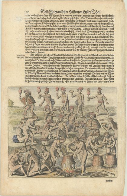 This striking engraving was originally published in Part III of De Bry's Grands Voyages (1592), which focuses on Brazil with accounts by Hans Staden and Jean de Léry. It documents the process of making an intoxicating beverage from the manioc or cassava root. Along the bottom of the engraving, the Tupinamba women boil the roots, chew them up, boil them again, and then let them ferment in barrels. (The process will look familiar to anyone who has seen Hondius's famous map of the Americas.) Above them the men get drunk on the concoction and celebrate. The engraving is based on a description in Hans Staden's account of his adventures in Brazil between 1546-55. The plate was republished in Johann Ludwig Gottfried's Newe Welt und Americanische Historien, a collection of voyages. Also known as Historia Antipodum, Gottfried's work is an abridgement of de Bry's voyages to America that incorporates much new material. Matthaus Merian, de Bry's son-in-law and publisher for Historia Antipodum, was granted access to de Bry's copper-engraved plates. On a sheet of German text measuring 9.0 x 14.0".