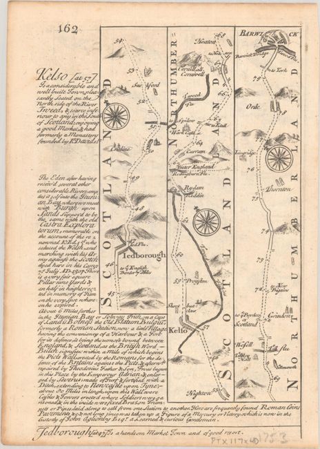 Britannia Depicta Or Ogilby Improv'd was the most popular and successful Ogilby derivative atlas, published in response to public demand for a small road atlas that could be easily carried by travelers. The atlas reproduced Ogilby's strip-style road maps and added individual county maps. It was published by Thomas Bowles in a series of editions between 1720 and 1764. The historical notes that accompany each map were compiled by John Owen, a respected lawyer and antiquarian. The maps were engraved by Emanuel Bowen who went on to become one of London's leading engravers and print sellers in the 18th century. The maps are embellished with coats of arms and contain immense detail and topographical information. A compass rose orients each map and useful landmarks include hills, bridges, rivers and streams, windmills, churches, markets, parks and forests, water wells and even gallows.
