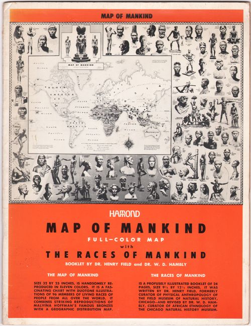 This is sculptor Malvina Hoffman’s controversial map showing the world surrounded by photographs of the statues she produced for the Chicago Field Museum to depict the world’s “racial stocks.” Each illustration is numbered with a corresponding location on the map. The racial depictions reinforcing stereotypes were questioned by some when the map was published. They became seen as blatantly offensive during the Civil Rights movement and under pressure Hammond withdrew the map from circulation. The map is accompanied by the 24-page booklet (9.4 x 12.2") describing different races by Dr. Henry Field, the former Curator of Physical Anthropology at the museum.