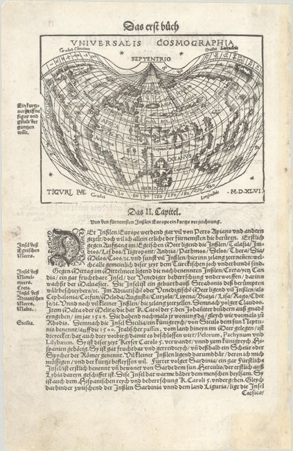 This scarce, heart-shaped world map is based on Waldseemuller’s important map of 1507 and Apian’s map of 1520. The map reflects Magellan’s reports of the South American continent and the vast Pacific Ocean. The North American coastline is depicted as part of a large island, with a direct route to Asia near the Equator. In Africa, two large lakes near the Mountains of the Moon are shown as the source of the Nile. The woodblock map was cut by Heinrich Vogtherr the Elder, whose monogram appears at bottom left as HVE. The map was first issued in Rudimenta Cosmographica, and was issued numerous times thereafter in a number of publications up to 1606. On a sheet of German text measuring 8.3 x 12.8".