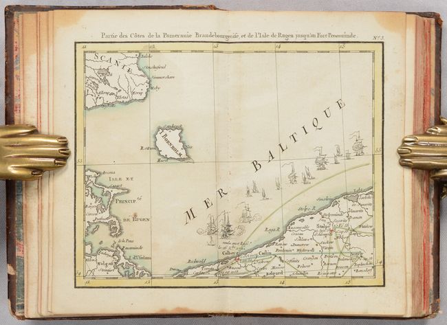 The maps have nice impressions and are in full contemporary color. There is a dampstain in the top corner of the text block that affects the entire volume, but only enters the image on the index map. There is minor soiling on the maps and in the text. There are old manuscript ink notations on the front free-endpaper. The covers are lightly scuffed and worn, with bumped corners and chips to the leather in the corners.
