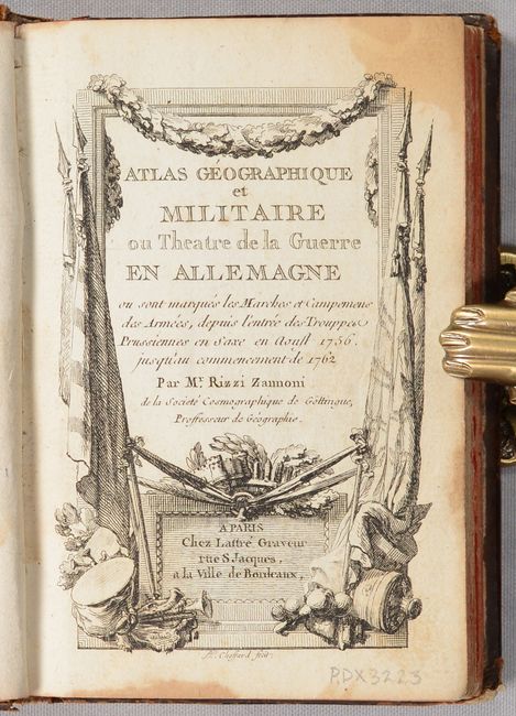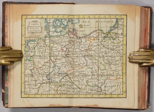This miniature atlas depicts the theater for the Seven Years' War between August 1756 and the beginning of 1762. It includes an index map of Central Europe, extending from the Netherlands, Belguim and France in the west to Hungary and Poland in the east, as well as 16 maps corresponding to each quadrant in the index map. These quadrant maps show the routes and encampments of each of the armies involved, color-coded to identify the Austrians, French, Swedish, Prussian, Russian, and the Imperial Army of the Holy Roman Empire. The color-coded key, distance scales, and list of battles depicted on the maps are included on a separate page after the maps. The atlas also includes a 72-page "Journal of the War in Germany" detailing the events, and a 4-page catalog of other maps available by Lattre, who also engraved the maps in this atlas.
