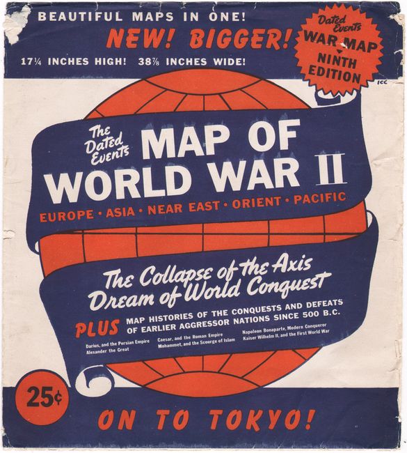 This is a fascinating and unusual later edition of Stanley Turner's series of colorful and informative WWII progress maps. Although it is labeled the "Ninth Edition," this edition was published after Victory in Europe Day. Major battles and events are located and dated throughout. The legend identifies Japan as the only remaining Axis power (in dark green), with Manchukuo, Korea, and much of Southeast Asia shown under Axis control (in light green). Much of Europe is colored orange to indicate that it had been reconquered by United Nations. Neutral countries appear in white. Six inset maps show various historical empires at their largest extents, including the Persian Empire, the Empire of Alexander the Great, the Roman Empire, the early Islamic conquests, Europe under Napoleon, and Asia under Genghis Khan. The "greatest penetration by the Germans under Kaiser William 1914-1918" is indicated by a dashed red line. Each inset includes a portrait of its empire's leader and one of his soldiers. Another inset at bottom extends map's coverage to show South Africa. A compass rose-like diagram at right shows the distance and direction of various cities relative to Tokyo. Printed in New York City by International Circulation Co, Inc. Produced by C.C. Petersen Advertising in Toronto. This example is accompanied by the map's original envelope, promising "7 Beautiful Maps in One!"