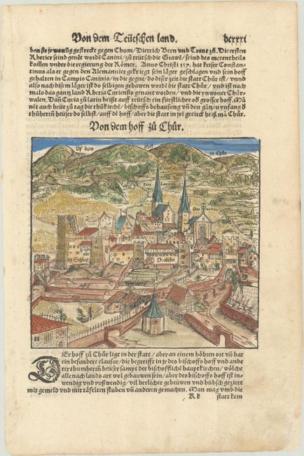 A lovely woodcut view of Chur, the oldest town in Switzerland, and the capital of the canton of Graubünden. Chur was established as a fortified Roman camp named Raetorum more than 5000 years ago. The ancient church of St. Luzius is shown and labeled, along with other points of interest within the walled medieval town. On a sheet of German text measuring 8.3 x 12.5".
