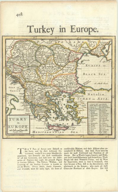 This striking map depicts the Ottoman Empire's holdings in Europe. According to the text below the map, "That Part of Europe now Subject to the Turks, and by their Arbitrary Government, render'd in a great Measure depopulated, was formerly the most considerable of all this Continent, and hath been the Habitation of Nations that made the greatest Figure in Ancient History." The maps spans the Balkans from Hungary, Transylvania, and Moldavia south to Candia (Crete). A key identifies 38 small Grecian islands. Moll's distinctive engraving style is a great favorite among collectors. On a sheet of English text measuring 7.8 x 12.6".